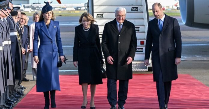 The royal event commenced as the Prince and Princess of Wales welcomed the German president and his wife to the UK for a significant state visit. Frank-Walter Steinmeier and Elke Budenbender were greeted at Heathrow Airport by the royal couple on behalf of the King. The arrival included a carpet lining party by The King’s Colour Squadron, Royal Air Force, to welcome the president’s plane adorned with the colors of the German flag.